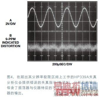验证振荡器的失真需要复杂的测量技术。如果试图用传统的失真分析仪去测量,就会遇到一些限制,哪怕采用了高端机型。示波器可以用于显示分析仪输出端的残留失真(图4)。对于任何与振荡器有关的信号活动,放大器的本底背景都显示出微弱的噪声与不确定性。