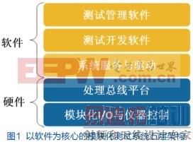 产品的完整性不仅是在硬件层面,相比传统仪器,基于PXI的模块化仪器需要更好的软件支持。比如一台传统示波器,只要接通电源就能进行各种基本的测量;而对于PXI数字化仪,则需要软件提供易用的软面板。在系统集成的过程中,并非将一些硬件模块凑在一起就可以实现所需的自动化测试功能,而是需要通过软件去定义具体的系统功能。通过软件完成的功能包括硬件配置、数据处理、结果显示与报告生成等多方面,这就更加需要厂商提供灵活易用的应用程序接口(API)以及应用开发环境。事实上,一个完整的自动化测试系统的构建应该遵循图1所示的五层架构,在这个架构中包含了三个软件层次。