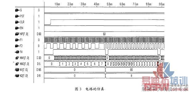 整个电路的仿真结果见图3,仿真时,将NP的值设为60。从仿真结果申可以看出,F4实质上便是实际门控信号,在F4的第1个上升沿,计数器1,2开始计数,计数值的变化情况见NNI和NNZ的波形。在F4的下降沿(同时对应信号F2的上升沿),锁存器将计数值锁存起来,得到计数值Nl,从,接着对计数器1,2清零。从图中可以看出,从=8,代表在实际阿门时向内,捕获了8个速度脉冲,同时对标准信号脉冲个数的计数值为65_(N1=65)o在下一个速度脉冲信号F2的上升沿到来后,开始第二轮测量,测量过程与第一次相同,不过由于速度信号的改变,使这次的实际闸门时间变短(Nlo62),而此时记录了19个速度脉冲个数(从=19)。