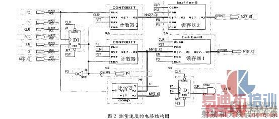 在电路刚开始工作时,由清零信号CLR对所有计数器、锁存器和D触发器清零。这样,计数器1的计数值NNI的初值为0,故此时NP>NNI,比较器输出为1,但此时Dl触发器的输出F4仍保此初值0,由于F4作用在计数器1,2的使能端,此时计数器没有开始计数,直到信号F2的上升沿到来后,Dl触发器的输出F4才翻转为l,允许两计数器计数。随着计数值的增加,当NNI>NP时,比较器输出等于o,不过此时计数器仍在计数,直到信号F2的又一上升沿到来后,F4二仇计数器停止计数,利用F4的下降沿(邢的上升沿)将此时的计数值NNI,NNZ分别通过锁存器1,2锁存起来。然后利用此时F4=0,经DZ触发器延时到信号F1的上升沿到来后,对计数器l,2清零。延时清零的原因是为了避免锁存器锁存数据与计数器清零同时进行,从而使存储数据出错。但由于延时清零,使实际门控信号的上升沿比速度信号F2的上升沿滞后,滞后时间为信号Fl的一个周期。为使检测结果准确,将计数器1的计数值加1即可。
