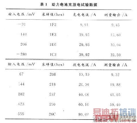动力电池充放电的大电流的测量可采用两种方式,最常见的就是采用霍尔传感器。因此选择合适的霍尔传感器是精确测量电路的关键。霍尔传感器的磁场灵敏度或者称磁场的开起点要与电机型号和结构相匹配。不同的电机型号和不同的电机设计结构转子磁场有不同的磁场分布和磁场分布涨落。如果霍尔传感器的磁灵敏度太高或者太低,由于转子磁钢和磁钢缝隙磁场分布的不规则涨落,会导致位置传感器给出错误的信号。此外,还要考虑霍尔传感器芯片的抗静电能力,霍尔传感器芯片的抗浪涌电压或抗浪涌电流能力。本文研究的系统采用型号为UGN3503UA的霍尔传感器。在测量电路的设计中需注意的是该传感器的输出为毫安级电流,因此必须选择合适的输入电阻将其转化为电压信号,并采用精度较高的放大、采样电路。表1是本系统的一次实验结果。