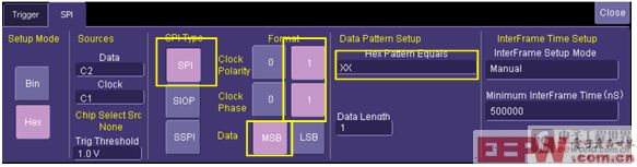 在力科示波器界面下进入菜单项“Trigger”->”Serial Data”->”SPI”,弹出的界面中允许用户按照特定的模式去触发SPI消息帧,如下图3所示。你可以根据自己的需求选择不同的数据对总线进行触发。可以选择对SPI总线标准下的某一子集(SPI、SIOP、SSPI)做触发。可以设置时钟的相位和极性,及数据的高位或者低位触发。可以输入需要触发的数据是多少,且数据的位数是可以调整的。也可以选择以2进制还是16进制做为触发的数据格式。