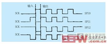 SPI是一个环形总线结构,由SS(CS)、SCK、SDI、SDO组成,在主设备和从设备之间双向传输,实现发送和接收数据,最高速率可达5Mbps。由SS(CS)信号来选定与主设备通信的从设备,所以在某时间点内主设备与从设备之间可实现点对点通信,其好处是不需要进行寻址操作。SPI共有4种工作模式,SP0、SP1、SP2、SP3,其中比较常用的是SP0、SP3。SPI模块为了和外设进行数据交换,根据外设工作要求,其输出串行同步时钟极性和相位可以进行配置,时钟极性(CPOL)对传输协议没有重大的影响。如果CPOL=0,串行同步时钟的空闲状态为低电平;如果CPOL=1,串行同步时钟的空闲状态为高电平。时钟相位(CPHA)能够配置用于选择两种不同的传输协议之一进行数据传输。如果CPHA=0,在串行同步时钟的第一个跳变沿(上升或下降)数据被采样;如果CPHA=1,在串行同步时钟的第二个跳变沿(上升或下降)数据被采样。SPI主模块和与之通信的外设时钟相位和极性应该一致。图2是SPI 总线4种工作模式时的SCK示意。