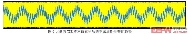 如果我们不用统计的方式来分析TIE抖动,而是在一个很长的时间轴上来看所有的TIE抖动值的变化趋势,即用如Lecroy示波器中的参数track的功能,我们也同样能够看出TIE抖动值的变化趋势: