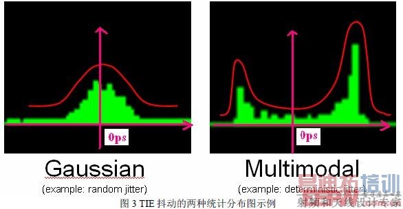 如果将所有边沿处的TIE抖动做一个直方图统计,我们可能会发现这些TIE值是具有一定的统计规律的,如下图所示分别为呈现高斯分布的TIE抖动以及呈现双峰分布的TIE抖动: