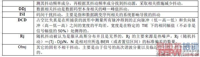 周期性抖动Pj为固有抖动Dj的一部分,除此以外,还有和数据码型相关的抖动DDj(数据相关性抖动);占空比失真引起的DCD抖动;因数据码型中0电平和1电平切换频率不同导致的码间干扰抖动ISI(因为不同频率的信号经过信道时衰减延迟是不一样的);由于高次谐波以及串扰引起的抖动,一般称为OBUJ(其它的固有不相干抖动),这类抖动属于固有抖动成分,但是数值很小,很容易和随机抖动Rj混到一起,不易区分,Lecroy的NQ-SCALE方法能够较好的区分出这类抖动。