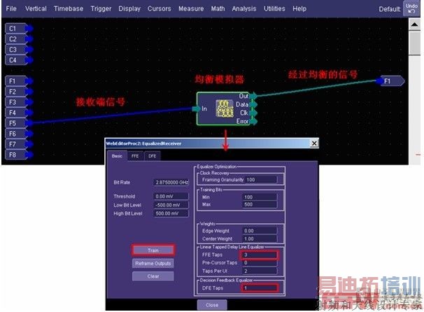 把经过背板的已衰减信号加到示波器的均衡模拟器上,查看经过均衡的信号眼图。根据接收芯片实际情况,我们把FFE和DFE的抽头数分别设为3和1,点击Train,对均衡器进行训练(图12),就得到了均衡后的信号,其眼图如图13所示。