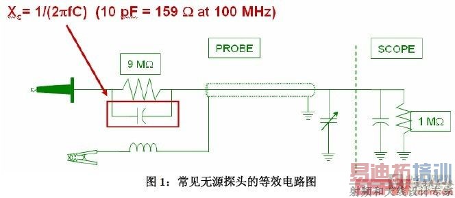 从无源探头的原理来看,如图1所示为常见的无源探头的简化电路图,通常示波器标配的无源探头的直流输入电阻为10兆欧(探头的9兆欧与示波器前端1兆欧串联),输入电容为10pf左右,与9兆欧电阻并联。当待测试信号的频率较高时,容抗随着频率升高而减小,所以无源探头整体的输入阻抗变小,当频率为100MHz时,输入阻抗为159欧。