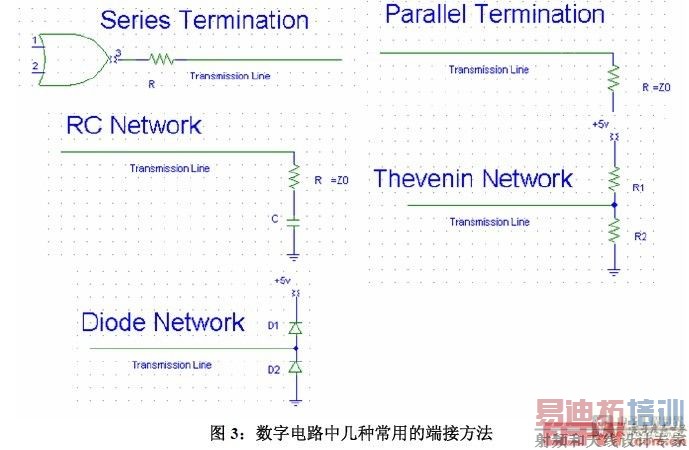 尽管并联了100欧电阻后电路板能正常工作了,但是接收端测量到的峰峰值高达6.2V,对于SDRAM芯片3.3V的工作电压来讲还是比较大的,长期工作可能会导致内存芯片出问题,所以,我们还需改进端接策略。在信号完整性书籍中,通常有串联匹配、并联匹配、RC网络、戴维南网络等端接方法,如下图3所示。相比并联匹配,串联匹配不用提供DC电流到地或者电源,不会对输出的高低电平产生影响,能减小过冲和EMI,所以我们接着尝试串联匹配下的信号质量。