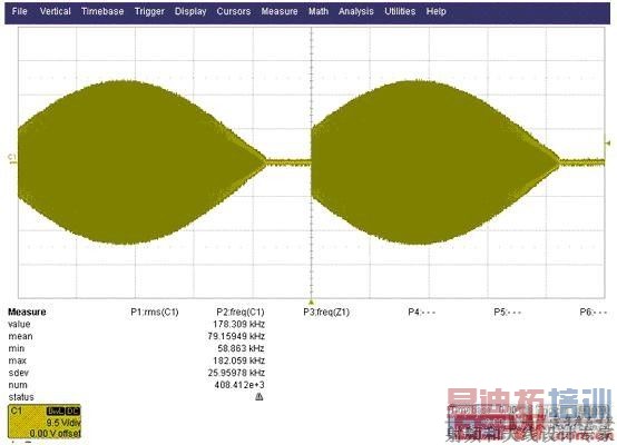 图9是一个实际测试案例。某做LED产品的客户需要测量图中的两个数据包络。工程师需要控制“包”内信号的幅度和频率的变化,以此来控制驱动电路。我们有没有办法只测量某一部分波形的参数呢?这就需要用到力科示波器RQM中的波形限定测量能力。