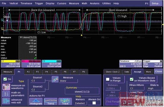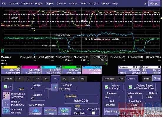 图7是利用波形门限测量功能自动测量有特定时序逻辑要求的参数的另一个示例。图8 则是RQM功能应用的一个典型案例。在SDRAM的时序测量中,要求写使能信号(C3)和片选信号(C4)均有效(低电平)时,测量Clock(C2)到Data(C1)的Hold Time(建立时间)。这里为实现精确的自动测量,同时设置了限定范围和波形门限的条件。