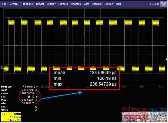 现有的测量门限用来选择想要进行测量的波形部分。容许限定测量后,不论是波形门限还是范围限定都是用来选择最终读出的是测量中的哪一部分。 下面通过几例常见的测量,深入了解一下RQM的应用。 图2中黄色波形轨迹C1是输入示波器的方波信号,使用参数P1测量其脉宽(width),打开测量统计功能后迅速发现捕获的波形中脉宽有异常——在当前测量的13个脉宽中平均值大约是184us,最大值是236us,而最小值为166ns!可见166ns脉宽的波形应该存在异常。对波形进行局部放大后很快就查看到了这个异常波形的细节——原来是一个很小的毛刺(Glitch)信号(图3)。 发现波形中存在毛刺后,相信大多数工程师会本能的考虑到这样两个问题:1)这个异常事件是偶发的还是可重复的?出现的概率如何?2)忽略掉毛刺,这个方波本身的脉宽如何测量出来?