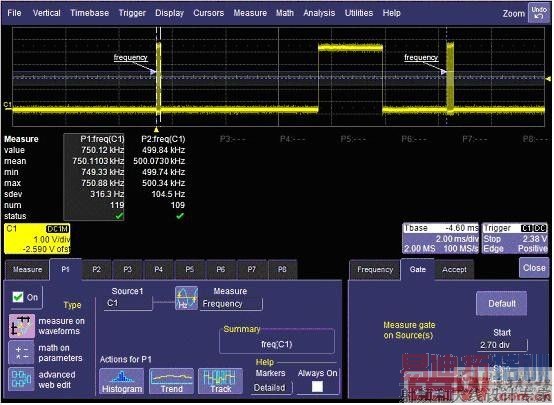 在选好测量参数(P1:freq)后,选择菜单中的“Gate”项(图11),并设置要测量波形的起始范围,也可利用光标的控制旋钮或者鼠标拖放来调整控制要限定的波形范围。设置完成后意味着当前选择的参数只对限定范围的这部分波形进行测量。图13使用同样的方法对另外一部分波形进行测量。因此,RQM的波形限定测量功能为我们提供了只对波形中部分研究对象进行自动测量的方法。 [p]