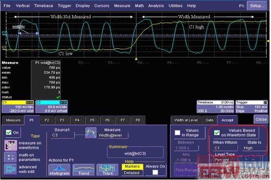 图6中,利用RQM功能,设置波形门限,测量当C1为高电平时C3信号的脉宽。