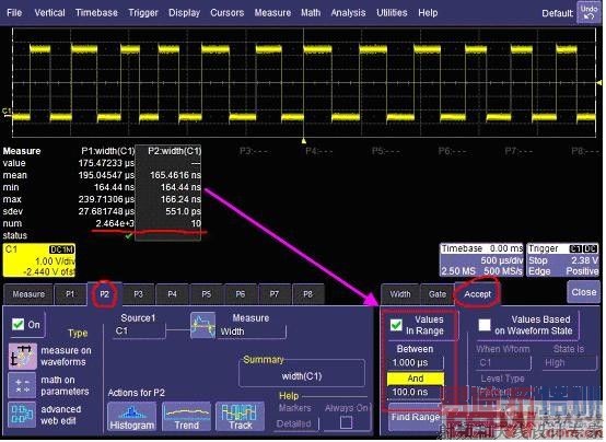 在本例中,继续用参数P2测量C1波形的脉宽,但仅研究我们感兴趣的事件即脉宽很小的毛刺信号。见图4,在P2的设置对话框中选择右下方的“Accept”项,激活“Values In Range”,设定的条件是只测量100ns到1us之间的脉宽(毛刺)。这样参数P1测量的是所有波形的脉宽,而P2只会自动测量符合我们设定条件的脉宽。清除掉之前的测量结果,同时开始测量后,我们看到在当前已测量到的2464个脉宽中,毛刺信号只出现了10次,可见这个异常事件较为罕见,但却有一定的规律性。