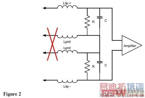 差分探头包括两个独立的输入端子和一个差分放大器,如Figure 2所示。因为有源电路只放大两个输入,公共地连接还有相关的电感被去除。剩下的电感是两个尖端电感的和,但是由于Ltip通常远小于Lgnd,负载电感变得很小。尖端电感也是固定的,不依赖于任何因不同用户而改变的地夹。此外,电容减半,因为负载电容和原有的输入电容串联。