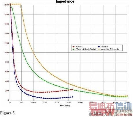 新设计的探头输入阻抗效应如何?Figure 5展示了Probe A阻抗 Vs 频率在有另外一个制造商没有仔细考虑减少输入谐振负载的Probe B之上。同时,新的WaveLink探头的负载效应也展示出来。由于是差分探头,有两条迹线——第一条显示了当做是单端探头(负输入当成是地连接)是时的阻抗,第二条显示了用平衡源驱动时的负载。迹线在每个探头的最大规定频率截止。