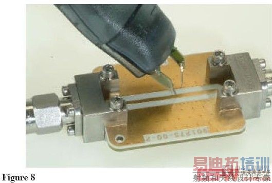 决定信号的探头负载效应是很难的。最简单的方法是通过可以探测信号的夹具连接信号(或者典型信号)到测量仪器的输入。这样的夹具如下图(Figure 8)所示。这是一个50欧姆微带传输线,提供到仪器的极低失真连接。使用这个夹具,可以测量信号在探头连接或不连接情况下检测信号形状的任何变化或由负载效应导致的时序。