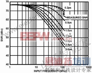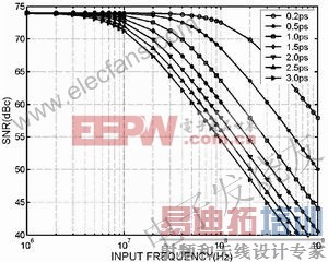 由图1可以看出时钟的抖动对ADC信噪比性能的恶化影响是十分明显的,相同时种抖动情形下进入到ADC的信号频率越高,其性能恶化就越大,同一输入信号频率情形下,采样时钟抖动越大,则ADC信噪比性能恶化也越大。对比图1中两个示意图可以看出实测的采样时钟抖动对ADC信噪比性能的影响同理论分析得到的结果是十分吻合的,这也证明了理论分析的正确性。因此,在实际应用时不能完全依据理想的信噪比公式来选择A/D转换芯片,而应该参考芯片制造商给出的实测性能曲线和所设计的采样时钟的抖动性能来合理选择适合设计需要的A/D转换芯片,并留出一定的设计裕量。