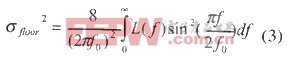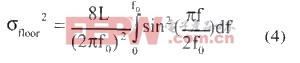 式中f0是振荡器的中心频率,f表示相对于中心频率的偏移,L(f)是在频率偏移f处的相位噪声(单位是dBc/Hz)。为了进一步改进系统的性能,人们往往在VCO的输出端使用一个频率响应类似于带通滤波器的功率匹配网络,这对带宽外的噪声有一定的衰减作用。这样,就能够利用从0 Hz到f0区间内的积分估算最差情况下的噪声,该范围以外的噪声被大大削弱,可以忽略,因为从0到f0范围内的噪声基底是平滑的,L(f)可视为常数,于是公式(3)简化为:
