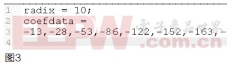 用Matlab的Filter Design & Analysis Tool生成滤波器系数,如图1所示。采样频率为3MHz,通带频率0.1MHz,阻带频率0.3MHz,39阶FIR低通滤波器,并将系数导出,转换为整数,有效位数16位,保存为.coe格式,如图2所示。