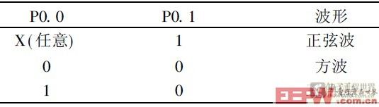 直接使用C8051F130 上I/ O 口P0. 0、P0. 1 连接MAX038 上A0 和A1 管脚, 对输入进行设置即能产生正弦波、方波和三角波, 管脚电平和波形之间的关系如表1所示。