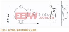 数字倾角(角度)传感器通过RS232与单片机接口。红线为电源输入,黑线为地(RS232地与电源地共用),黄线为传感器的RS232输入,绿线为传感器的RS232输出。输入电源电压为7V-24V,推荐值9V。传感器应竖直安装,安装面与垂直面的夹角不大于2°。安装示意图见图3。
