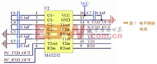 MAX232是单电源双RS232发送/接受芯片,采用单一+5V电源供电,只需外接4个电容,便可构成标准的RS232通信接口。单片机和计算机、数字倾角(角度)传感器接口电路如图7所示。图中的C3、C4、C5、C6是电荷泵升压及电压反转部分电路,产生V+、V-电源供EIA电平转换使用,C7 是VCC对地去藕电容,其值均为0.1μF。电容C3~C7安装时必须尽量靠近MAX232芯片引脚,以提高抗干扰能力。