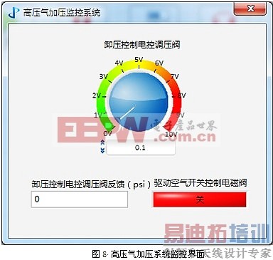 试验参数配置完成后,点击软件主界面上的“开始”按钮,此时弹出窗口,要求操作人员输入存盘路径和文件名,保存数据文件和配置文件,便于数据回放和下次调用。开始试验后,弹出液压系统、高压水加压系统、高压气加压系统监控界面,如图6至图8所示。界面上包含所有执行元件的启停开关与工作状态,以及监控传感器的反馈值,替代了硬件指示灯、按钮以及传统的二次仪表。