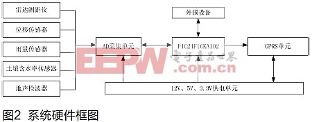 本文主要研究多参数采集传输仪的研制,本系统硬件部分采用Microchip公司的PIC24F32KA302作为处理器,该芯片功耗低、内存容量大。整个硬件电路中元器件都按照工业级标准进行选择,保证能够满足野外地质灾害监测的需求。硬件主要包括前端传感器、A/D采集单元、供电单元、GPRS通信单元及外围设备,系统通过太阳能板给12V蓄电池供电,电路中由12V电压分别做转换处理,得到5V和3.3V电压,供给PIC单片机和AD等使用。系统具有4路A/D采集通道和1路雨量采集通道,可以同时接五种传感器,系统在PIC24F32KA302的控制下采集模拟量信号,将数据存储在内存中,通信单元将数据以Socket TCP的形式发送到应急中心的服务器软件上。硬件系统的原理框图如图1所示。