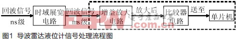 根据系统要求,本设计采用脉冲时域展宽电路进行信号处理,如图1所示,在收发电路的硬件电路上增加脉冲时域展宽电路,主要是实现回波信号在时间轴上把信号放大K倍。放大后的信号变换成毫秒级信号,就可以使用比较器比较出来,再用单片机进行信号的捕获。