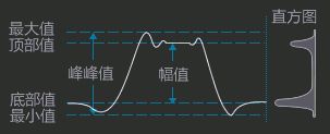 2、自动测量,当示波器正确捕获波形后,示波器可以对波形参数进行自动测量。自动测量需要参考点,一般称为Vtop(顶部值) 和Vbase(底部值),参考点的测量采用幅度统计方法。示波器的工作过程是对捕获波形进行的幅度分析,先确定最大值Max和最小值Min,然后对最小电压上的40%和最大电压下的40%进行分析,然后进行累积概率统计,出现概率最大的值为Vtop 和Vbase。不用统计中间20%部分,防止被测波形是3态信号得出错误结果。