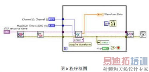 左边的三个控制用于输入设置,包括连接的VISA 资源名称,获取数据的通道,最大延迟时如何实现对示波器的远程控制间。右边为结果波形显示控件。设计好前面板以后,就可以进入程序框图设计了。在VI 的程序框图中的Function 面板中,选择“仪器I/O”可以找到有关ZDS2024 的驱动库的模块,可以在程序框图中直接使用,设计结果如图5 所示。