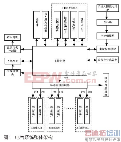 采用STM32作为主控制器,它通过异步串口通讯将控制指令分别传输给16路舵机控制器、无线摄像头、直流电机控制器和探照灯;主控制器与人机界面、十自由度传感器、电量检测模块、温湿度传感器组和体外压力传感器之间实现了数据的双向传输;舵机控制器可发送16路独立的PWM波给舵机,以实现对机器人运动姿态的控制,并与十自由度传感器结合实现了对蛇体的闭环控制。电气系统整体架构如图1所示。