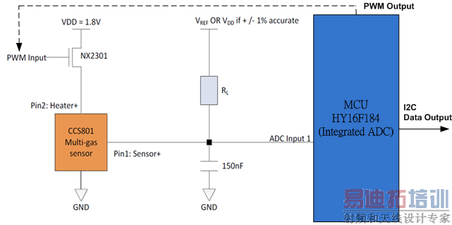 近年来由于日趋严重的环境污染及工业上之需求,使得传感器的发展倍受重视。在空气污染防治日益复杂及工业上迫切需要的今日,高效能的气体传感器愈来愈受重视。以金属氧化物半导体(MOS)为材料之气体传感器,由于其耐热性及耐蚀性佳、应答速率快、组件制作容易,以及易与微处理器组合成气体感测系统或携带式监测器,因此被广泛的使用在家庭、工厂环境中以侦测毒性气体及燃烧爆炸性气体。而本文将介绍以HY16F184内建高精密Sigma-Delta 24 Bit ADC搭配CCS801 CMOS Sensor来实现一个Gas Sensor应用电路。 在本文中的Gas Sensor应用电路上,主要的组件有:气体传感器(CCS801 Gas Sensor)、ADC和MCU控制芯片。 而纮康HY16F184控制芯片内建高精密Sigma-delta 24 Bit ADC、可程序放大PGA和多段式稳压输出等功能,可以很大幅简化PCB周边线路,精准完成由模拟到数字的讯号转换。