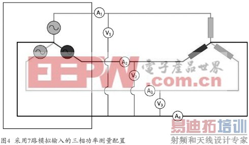 现在,我们需要稍做修改。然而,仅使用两个功率计,是不能计算每相功率的;如图4所示,测量每相的功率基本要求三个功率计,每相一个,此时将零线用作地参考点。对于负载不平衡的4线三相系统,零线中有电流。尽管可对全部三相电流进行求和,从而计算得到通过零线的电流,但额外增加一个电流表来测量零线的电流更简单。此外,在发生电流故障时,这种方法提供的数据更有效。