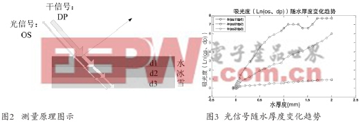 采用的是三个波长的阵列光谱法,根据水冰雪对三个波长的光信号具有不同的吸光系数,可以判断覆盖物类型;根据物质的吸光度可以计算覆盖物厚度[4]。