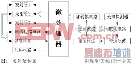 使用单色性好、体积小、工作电压低的激光二极管提供阵列式红外光源,以脉冲调制波发射红外光束,利用反馈电流稳定光功率[3]、温度补偿稳定光谱;光电二极管接收反射回来的微弱的红外光信号,利用两级电路进行滤波、放大,然后进行AD转换,送入微处理器,进入模型计算(如图1)。
