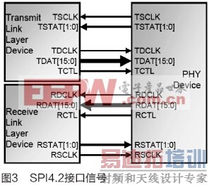 SPI4.2接口信号按照收、发方向分为两组,如图3中,以T开头的发送信号组和以R开头的接收信号组。每组又分为两类,以发送信号组为例,有数据类和状态类,其中数据类包含TDCLK、TDAT[15:0],TCTL,状态类包含TSCLK,TSTAT[1:0]。