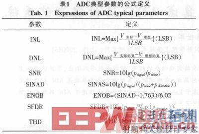 表征ADC性能的参数通常可分为静态参数和动态参数。其中,静态参数描述的是ADC自身的内在特性,与所设计的ADC内部电路的误差和噪声有关,这些误差包括ADC的增益误差、失调误差、积分非线性(INL)和微分非线性(DNL)等,主要关注的是具体的模拟输入电平与相应数字输出代码之间的关系,表征静止的模拟输入信号转换成数字输出信号的精确度;而动态参数描述的是ADC采样和重现时序变化信号的能力,关注ADC在交流条件情况下的性能表现,主要包括信噪比(SNR)、无杂散动态范围(SFDR)、总谐波失真(THD)、信纳比(SINAD)以及有效位数(EN OB)等,这些参数的测试都是通过对输入合适的正弦模拟信号并获取了芯片正确转换得到的数字码之后,进行快速傅氏变换(FFT)计算得来的。表1为ADC典型参数的公式定义。
