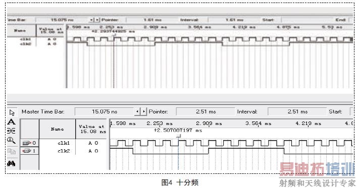 如图4所示给clk1一个5KHz的频率,经过十分频后clk2输出0.5KHz,clk1的周期是0.2ms,经过十分频后是2ms
