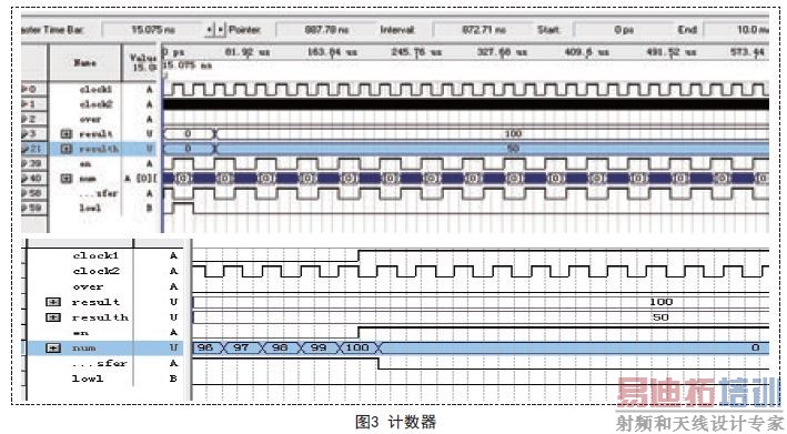 为了方便观察,将数值改小,计数值大于100且小于或等于1000时输出!将clock1设为50K,clock2计数时钟设为5M,得出仿真如图3所示Result为100符合计数要求。