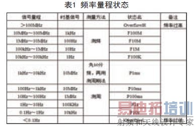 该系统设计的控制器是由状态机实现,通过在不同测量档位,选择合理的时基信号频率降低误差,确定各状态转移条件和状态名,采用低频档位测周,高频档位测频的方法。20MHz晶振送入分频器,分出各档时基信号和其它模块所需的触发信号,分频器将各档时基信号传给状态机,同时待测信号进入状态机,状念机进行状态转换,将量程溢出信号和状态显示信号表征在发光二极管上。如图表1所示。