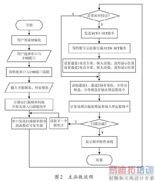 本文采用VISA 接口方式实现LabVIEW 与数字数字示波器的通信。其目的是控制DDS信号源产生给定范围的扫频信号,借助数字示波器进行有效值测量与计算,获取计算结果后作出频率特性曲线。主函数流程如图2所示。