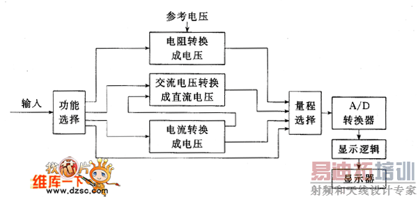 数字万用表的基本组成框图如图所示。它主要由两大部分组成:第一部分是输入与变换部分,主要作用是通过电流-电压转换器(I/U转换器)、交一直流转换器(AC/DC转换器)、电阻-电压转换器(R/U转换器)将各被测量转换成直流电压量,再通过量程选择开关,经放大或衰减电路送A/D转换器后进行测量;第二部分是A/D转换电路与显示部分,其构成和作用与直流数字电压表的电路相同。因此,数字万用表是以直流数字电压表作基本表,配接与之成线性关系的直流电压、电流,交流电压、电流,欧姆变换器,即能将各自对应的电参量高准确度地用数字显示出来。
