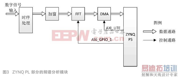 频谱分析模块主要由时序处理模块、加窗模块、FFT模块及DMA模块完成,FFT的点数由ZYNQ PS部分通过AXI_GPIO模块控制,图3为ZYNQ PL频谱分析部分的框图。