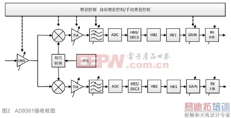 如图2所示,为AD9361的接收通路,AD9361接收通路完成射频信号到基带信号的部分。基带信号处理包括两个可编程的模拟低通滤波器,一个12bit ADC,以及4级的数字下变频滤波器。每个数字下变频滤波器都可以被略去。其中I/Q两路的接收通路是相同的[4]。