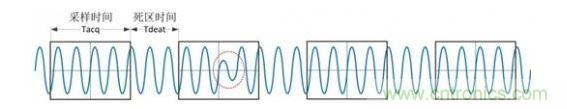 图1.1 示波器采样过程示意图 影响波形刷新率的因素有哪些? 采样时间和死区时间 如图1.1中所示,波形刷新率为Tacq(采样时间)和Tdeat(死区时间)的倒数,其中采样时间由示波器屏幕的采样窗格决定,用水平时基档位乘以水平方向格数,当水平时基确定后,采样时间就会固定。 而死区时间是由示波器的处理能力决定的,当示波器对数据处理能力不足时,就会对采集的大数据不能及时进行处理,死区时间就会变长,刷新率就会降低;当示波器对数据的处理能力很强时,死区时间就会变短,相应刷新率就会很高。因此死区时间是影响刷新率的重要因素。 触发释抑时间 增大触发释抑时间相当于变相地增加了死区时间,因为在释抑期间,触发电路封闭,触发功能暂停,即使有满足触发条件的信号波形示波器也不会触发,所以也会影响刷新率。但触发释抑时间并非指死区时间。