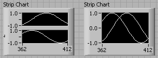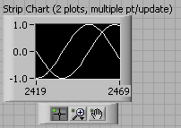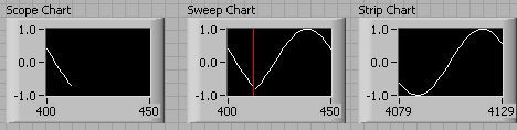 带状记录纸模式的显示和真正的带状记录设备的显示相像。示波器图模式则和真正示波器的曲线显示相像,该模式中当曲线到达波形图的右边界之后,整个曲线就会清除并从波形图的左边界重新开始显示。扫描图模式与示波器图模式十分相似,不过扫描图模式中曲线到达右边界后并不会有清除动作,而是有一个竖线出现在波形图中,该竖线标识着新数据的开始,并在新数据不停添加的时候,该竖线会慢慢移动。这些区别在看到实际波形图控件在不同刷新模式先运行之后就很容易区别开来的。由于示波器图模式与扫描图模式在追溯以往曲线上比带状记录纸模式的开销要少,所以这两种数据更新模式要比带状记录纸模式很明显的快得多。