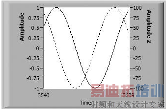 如果一个波形图中有多条曲线,并且在覆盖模式下进行显示,有些时候就需要为每条曲线设定不同的Y轴标度。例如,一条曲线的Y值范围是从-1到+1,另一条曲线的Y值范围是-100到+100,这是使用覆盖模式并以同一个标度的Y轴进行显示就可能看不清Y值范围较小的那条曲线,这时使用多标度的Y轴就显得必要了。使用多标度Y轴的具体步骤如下,首先在Y轴点击鼠标右键在弹出的右键菜单中选择Duplicate Scale选项;之后,在这个新标度上点击鼠标右键,在右键菜单中选择Swap Sides将这个复制的标度移动到曲线图的另一侧。具体哪个坐标对应哪条曲线可以在波形图的属性对话框里修改。如果需要删除一个Y轴标度,就在该标度上点击鼠标右键并选择Delete Scale选项即可。下图是一个使用了两个Y轴标度的波形图的示例: